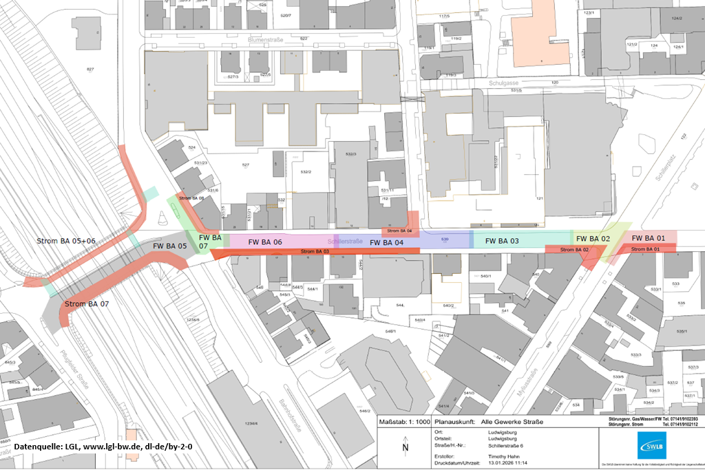 Ende Februar beginnen die Stadtwerke-Ludwigsburg-Kornwestheim (SWLB) mit der ersten Phase einer umfangreichen Baumaßnahme, in deren Verlauf die Schillerstraße und der Schillerdurchlass bis Jahresende mit Fernwärme und neuen Stromleitungen ausgestattet werden. Die Gesamtmaßnahme gliedert sich in zwölf Bauphasen, die wiederum acht Bauabschnitte für Strom- und sieben Bauabschnitte für Fernwärmearbeiten beinhalten. In einzelnen Bauphasen kommen Arbeiten am Gas- und Wassernetz hinzu. Um die Bauzeit zu verkürzen, können mehrere Bauphasen parallel stattfinden.